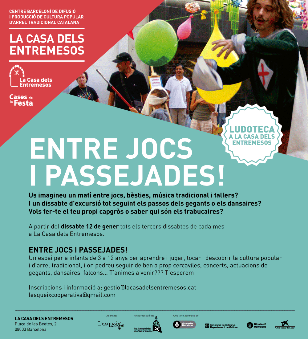 A partir d’ara tot això i més serà possible els tercers dissabtes de cada mes a La Casa dels Entremesos. El dia 12 de gener, jornada de portes obertes, comença L’ENTRE JOCS I PASSEJADES!: Un espai per a infants de 3 a 12 anys on aprendre i jugar, tocat i descobrir la cultura popular i d’arrel tradicional, i on podreu seguir de ben a prop cercaviles, concerts, actuacions de gegants, dansaires, falcons... T’animes a venir??? T’esperem!