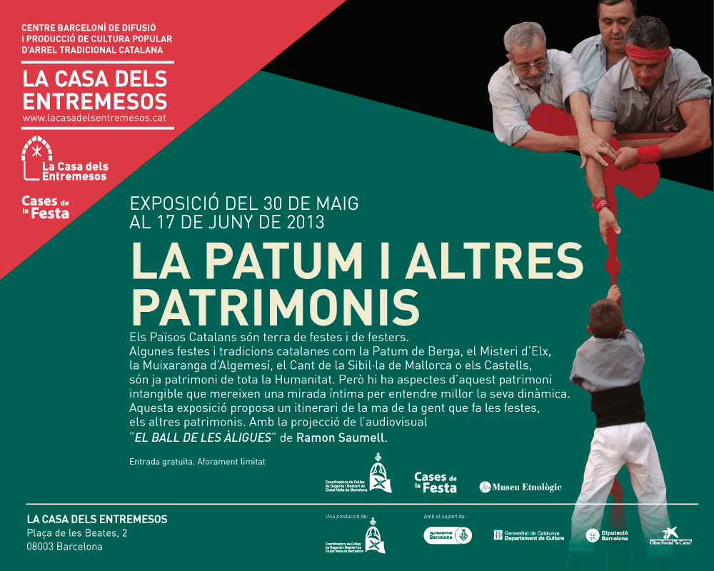 Els Països Catalans són terra de festes i de festers. Algunes festes i tradicions catalanes com la Patum de Berga, el Misteri d'Elx, la Muixaranga d'Algemesí, el Cant de la Sibil·la de Mallorca o els Castells, són ja patrimoni de tota la Humanitat. Però hi ha aspectes d'aquest patrimoni intangible que mereixen una mirada íntima per entendre millor la seva dinàmica. Aquesta exposició proposa un itinerari de la ma de la gent que fa les festes, els altres patrimonis.