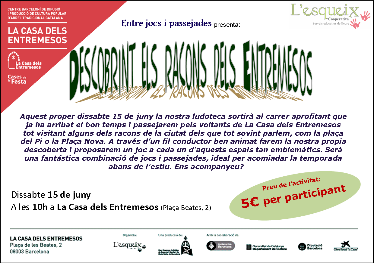Sortirem el carrer tot aprofitant que ja ha arribat el bon temps i passejarem tot visitant alguns dels racons de la nostra ciutat molt vinculats amb els gegants i bestiari: la plaça Nova, l’església del Pi, Sant Pere, el Palau de la Virreina... Acompanyats del capgròs "Entremès" farem la nostra pròpia descoberta i us proposarem un joc tradicional a cada un d’aquests espais tan emblemàtics... Ens acompanyeu?