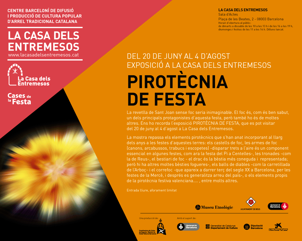 La revetlla de Sant Joan sense foc seria inimaginable. El foc és un dels principals protagonistes d’aquesta festa, però també ho és de moltes altres. La mostra repassa els elements pirotècnics que s’han anat incorporant al llarg dels anys a les festes catalanes: els castells de foc, les armes de foc (canons, arcabussos, trabucs i escopetes), les tronades, el bestiari de foc, els balls de diables i el correfoc o els elements propis de la pirotècnia festiva valenciana.... , entre molts altres.